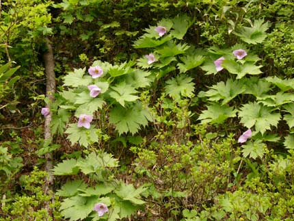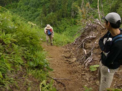 先にザレた急斜面が見え、このあたりから最初の花畑が見られる。