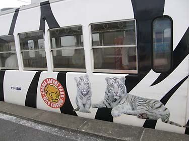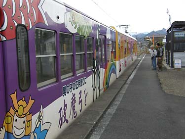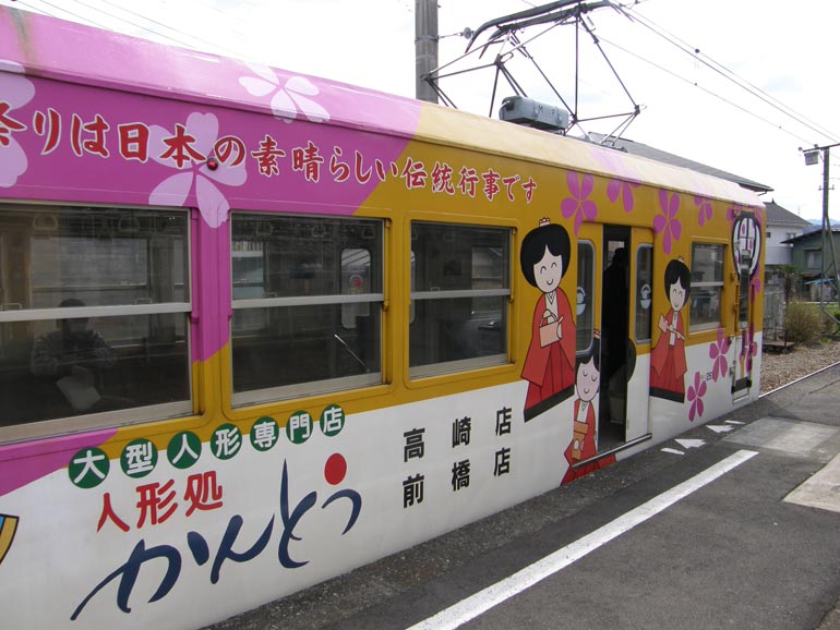 | メチャ派手だが子供受けするイラストが描かれた電車(南蛇井駅下車時撮影) 無人駅での乗降時は最前部のドアしか開かないので要注意 |