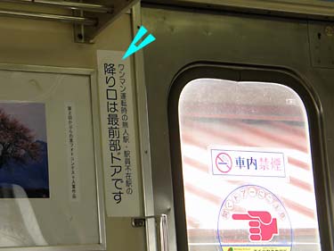 | 最後尾の「乗り口」案内位置に立つも、待てど暮らせど開かない自動ドアに ??? 県外からのお客さん向けに、車内よりはドアの目立つところに案内表示が必要と思うが・・・上信電鉄さんご一考を! |