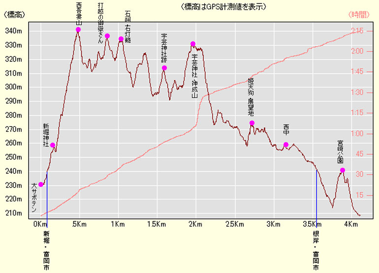 | (計曲線 100M 主曲線 20M) 最低標高地/203.5M 標高差/136.6M かのはら駅までの歩行距離/6170M 総歩行距離/9273M |
