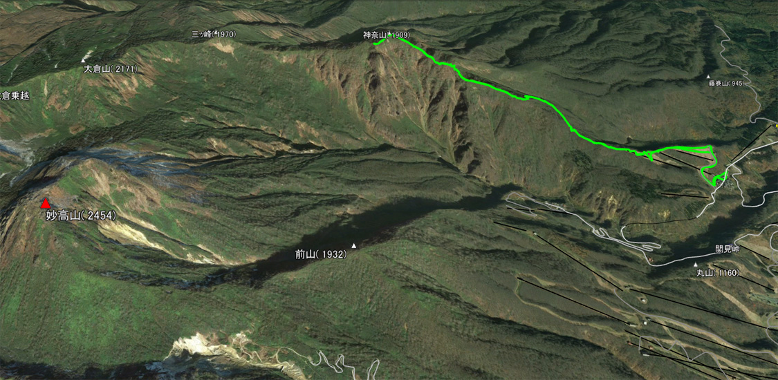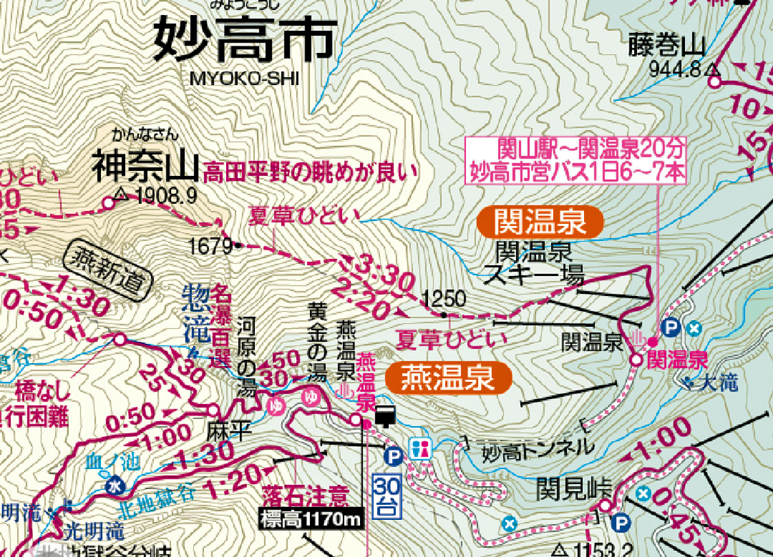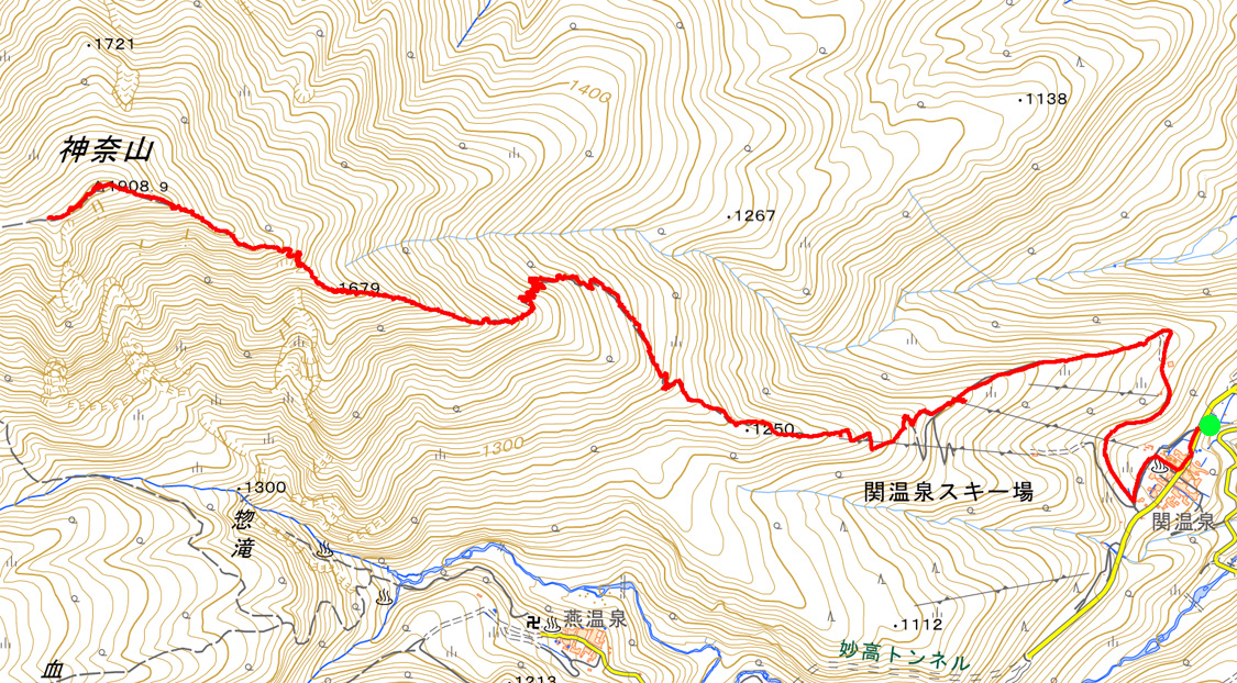 | 神奈山ルート地図 (計曲線 50M 主曲線 10M) 駐車場標高/898M 標高差/1015M 累積標高/1075M 総歩行距離/9241M |