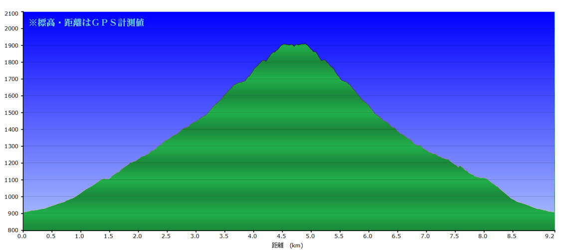 | 神奈山高低図 駐車場標高/898M 標高差/1015M 累積標高/1075M 総歩行距離/9241M |