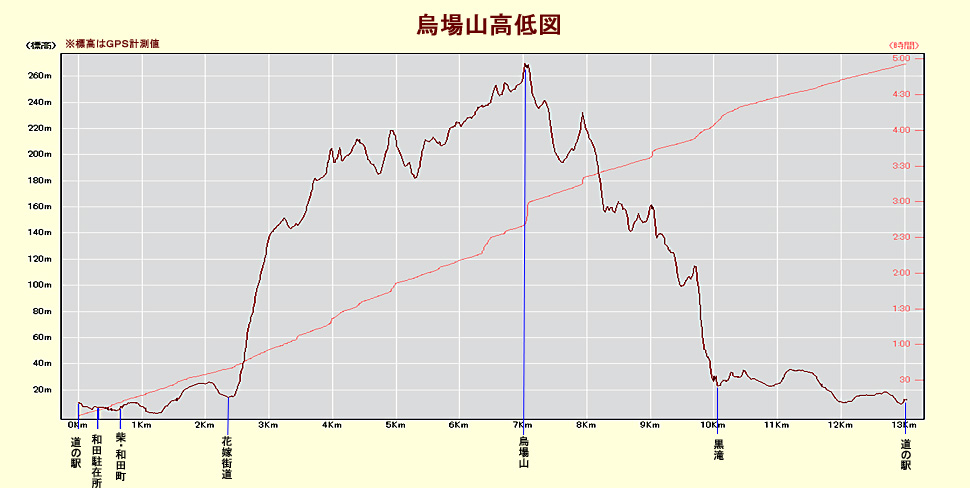 道の駅駐車場標高 10M 標高差 256M 総歩行距離 13034M |