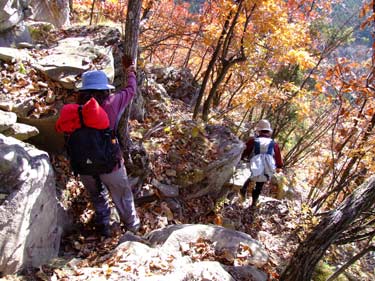 千憎坊からの下りは丸太の階段で、要所要所にはロープも張られているが、かなりの急坂なので足下に注