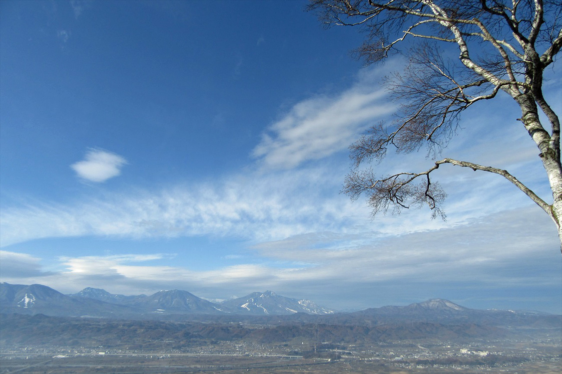 | 北信五岳 (左から飯縄山・戸隠連峰の高妻山・黒姫山・妙高山・斑尾山) |