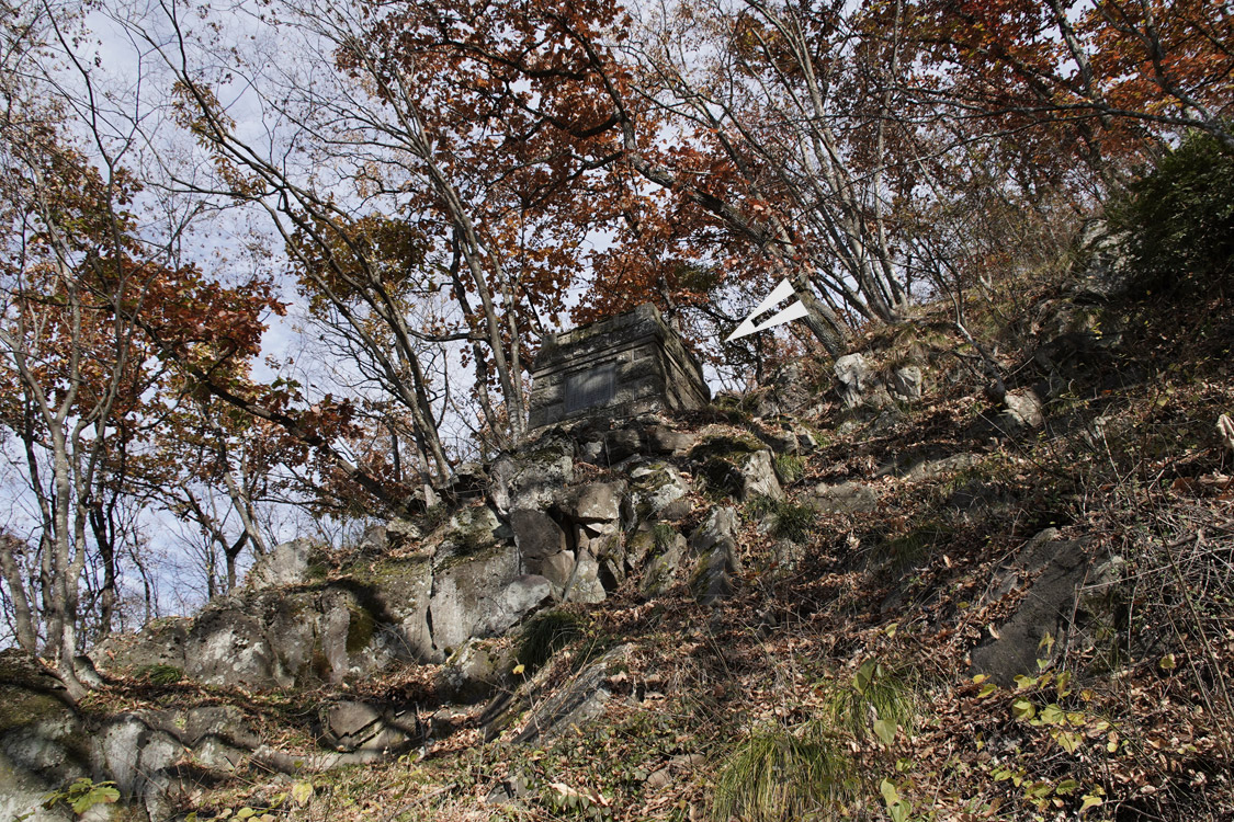 | 小布施の偉人・豊田正助の銅像跡(大正11年11月建立) 村長や小布施銀行の頭取を歴任 この山の元地主で現在は岩松院に寄付、銅像部分は戦時中の鉄類(銅や鉄など)回収令で供出 小布施町教育委員会 |
