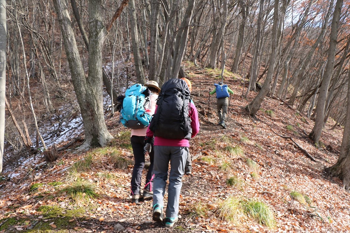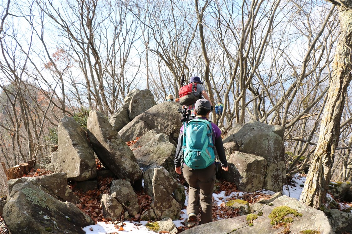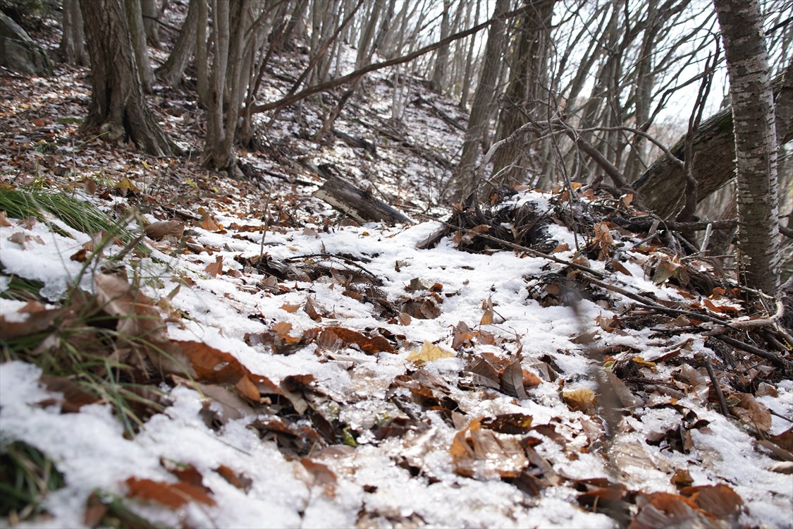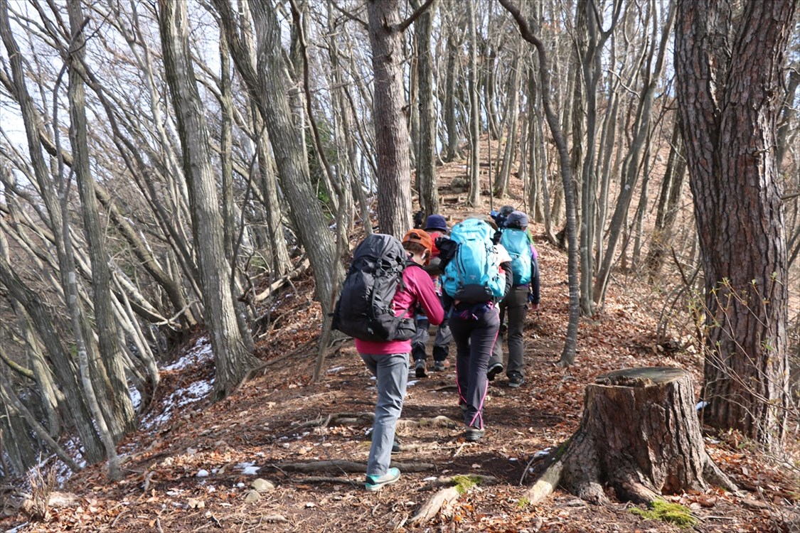 | 雁田山への稜線は前日の残雪が薄く残る 千僧坊から鬼のつぼや分岐点までは緩いアップダウンが連続する |