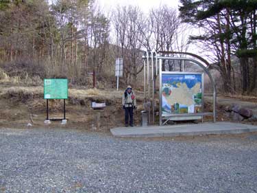 | 登山口駐車場 茅ヶ岳登山マップと韮崎の案内板 |