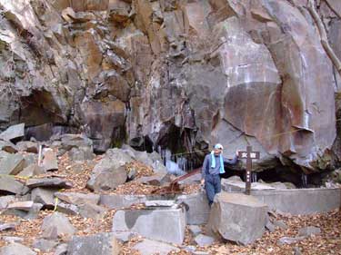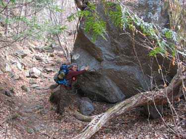 | 行く手を塞ぐ大岩が現れる | 《写真にマウスを》 女岩⇔水場 D岩の隙間からしみ出る水が氷柱になっている |