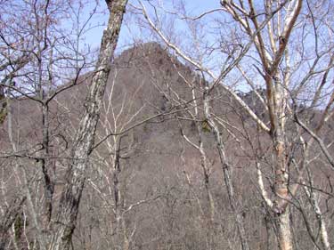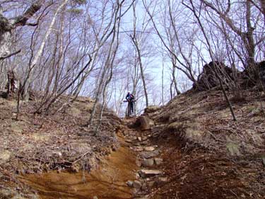 | ぬかるんだ急坂を下る | 木立の間から金ヶ岳南峰の急登を望む | |||