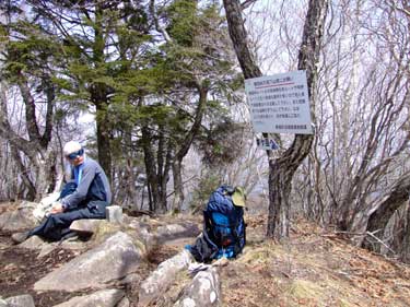 | G金ヶ岳南峰でひと休み 茅ヶ岳まで40分の表示板あり |