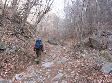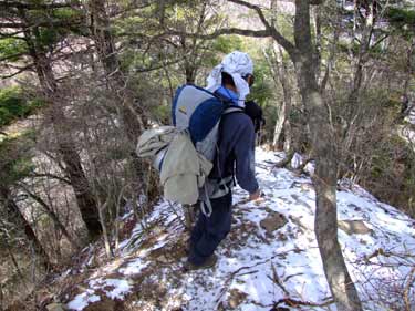 | 九十九折りの急勾配に喘ぐ管理人 | 敷島分岐点が見えてきた 登山地図にはルートの書き込みが無い |