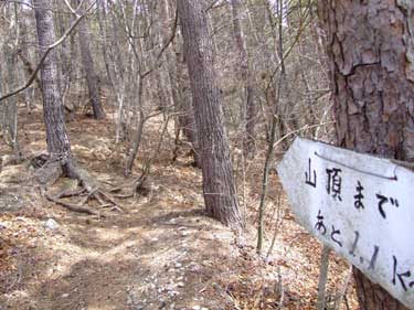 | J金ヶ岳山頂まで1.1kの表示板 | 痩せ尾根を過ぎるとブナや赤松の樹林帯歩きとなる | |||