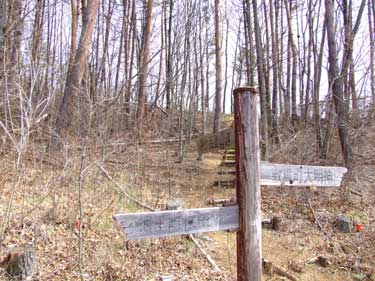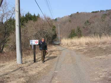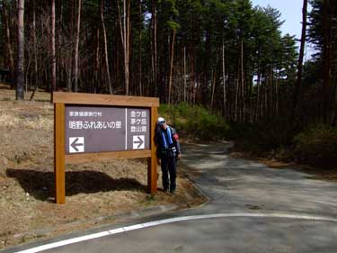 | K健康旅行村「ふれあいの里」上部の登山口標柱 林道を横切り鉄ゲートをくぐって「ふれあいの里」入り口へ |