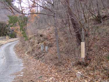 石仏2体 枝に駐車場と書かれた木札がぶら下がる 補足/2009.3より機械が入り景色は一変しています |