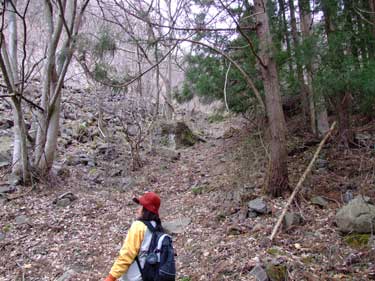 | 信州山学クラブ設置の登山口案内板 | 登山道の両サイドは岩ゴロ地帯 | |||