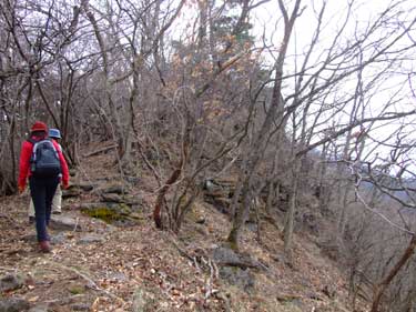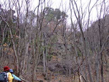 | 栗の大木(栗ノ木分岐点) 失敗談/ここを左(南)に大きく巻いて南側の尾根に取り付くべき所を、栗の木直下(上りルート脇)の 小さい尾根に入り込んで上の写真岩壁地点に下山 |