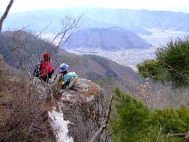 | 高見岩下部の岩頭部・標高926m地点からの展望 手前中央・尼巌山781mと松代町 前方は北アルプスの大パノラマ |