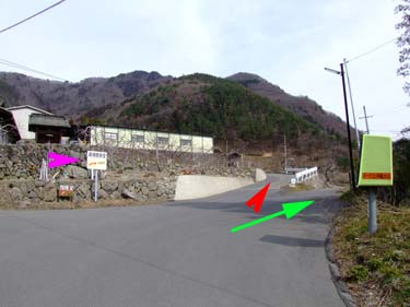 | 清滝観音案内板 赤・奇妙山登山口へ 緑・清滝へ |
