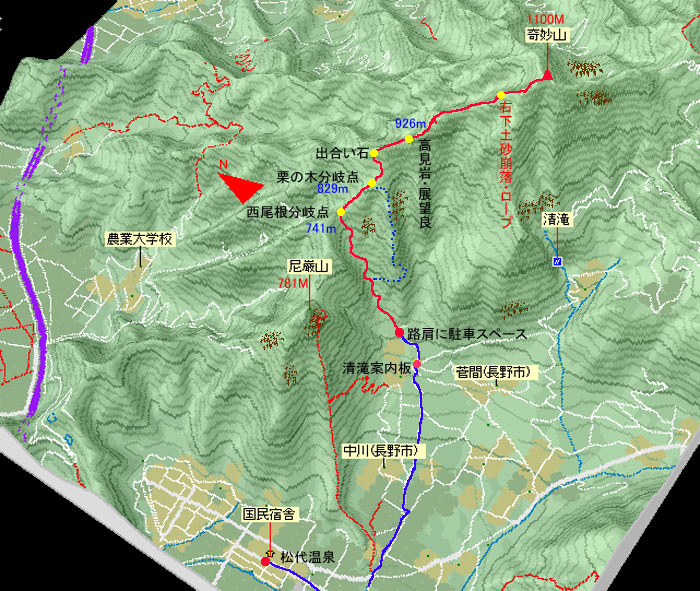 奇妙山登山地図![]() 青点線・栗ノ木分岐ルートと思われる |