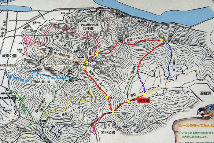 | ★行程&所要時間 長野発 5:20 〜 伊那北IC 6:40(1350円)−中津川IC 7:40(1450円) −途中休憩−岐阜各務原IC(1250円)〜 駐車場着 9:43 長野IC〜岐阜各務原の通常料金 6250円(通勤割引合計4050円で深夜割引よりお得) 駐車場発 10:04 〜 東坂R・達目R登山口道標 10:06 〜 東坂R分岐点(台地)10:15 〜 唐釜R分岐点 10:24 〜 迂回路分岐点 10:24 〜 岐阜城(金華山)着 10:41 (大休) 岐阜城発 11:00 〜 鼻高R分岐点 11:04 〜 大参道R分岐点 11:25 〜 達目R経由 〜 東坂R分岐点(台地)11:55 〜 駐車場着 12:00 道の駅車中泊 磯部の里「もとす」 |