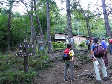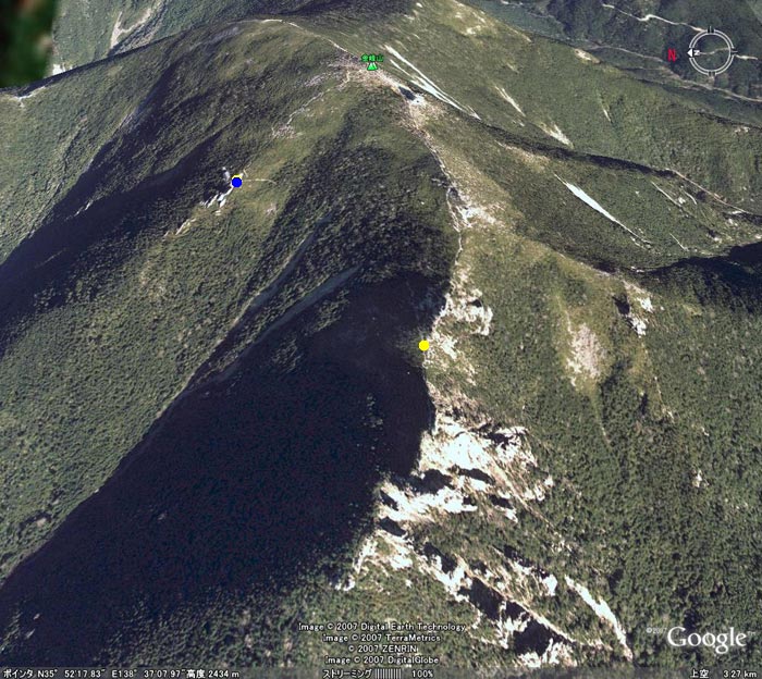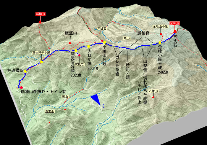黄色/金峰山小屋分岐 青色/金峰山小屋 黄色の手前/切れ落ちた絶壁(岩稜)