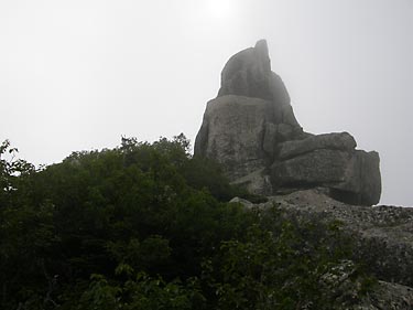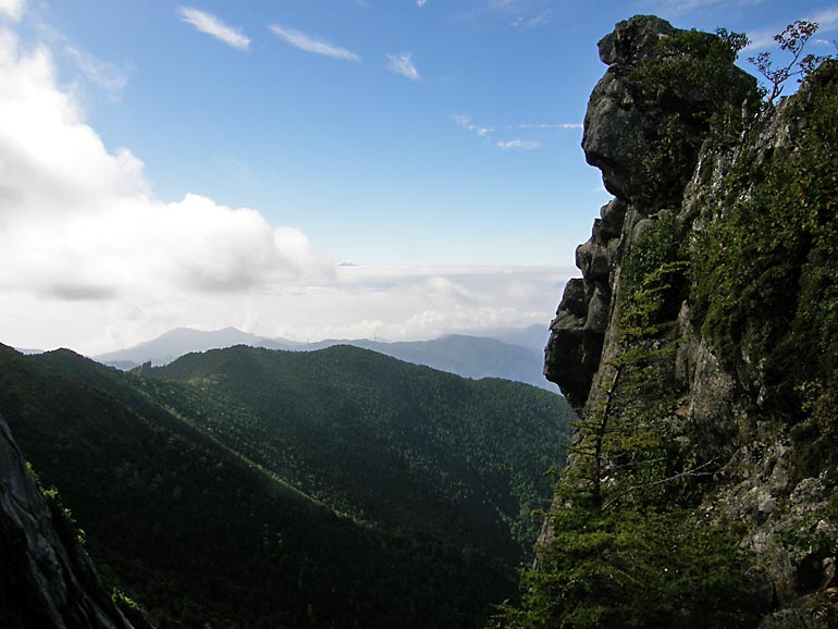 山梨県側に切れ落ちた岩壁と雲の中の金峰山 |