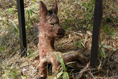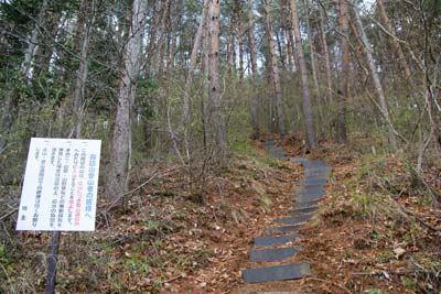| 登山口の狛犬? 実は木の根っ子 | 登山口の急坂は滑り止め階段に | |||
