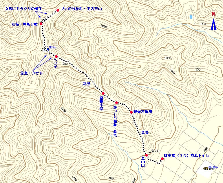 | (計曲線 50M 主曲線 10M) 駐車場標高/872M 標高差/433M 総歩行距離/5261M |