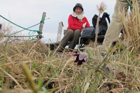 | 翁草目当ての登山者で賑わう霧訪山 | 登山者の足元で咲く翁草 | |||