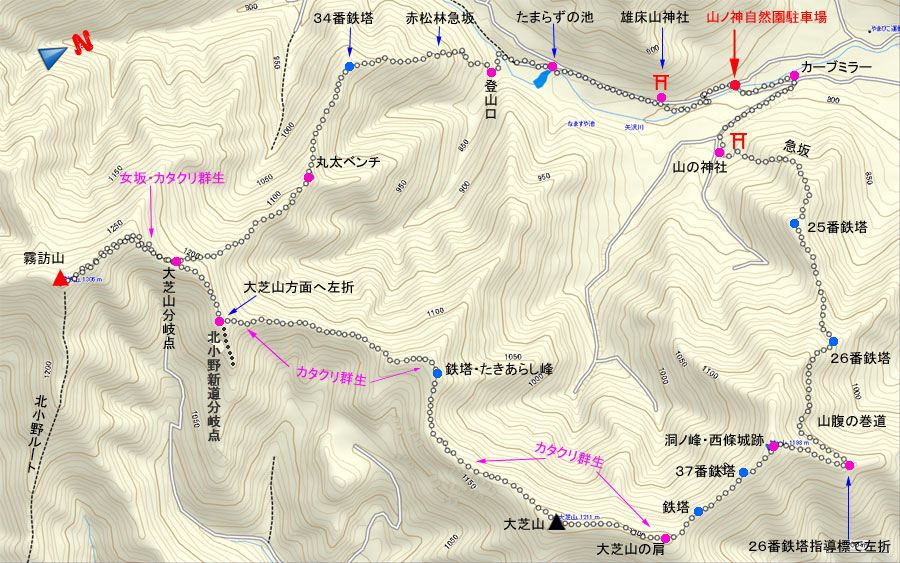 | 霧訪山〜大芝山登山地図 ※霧訪山から大芝山へ向かう場合2013年新設Rの北尾根新道指導標に惑わされないよう注意 ![]() |