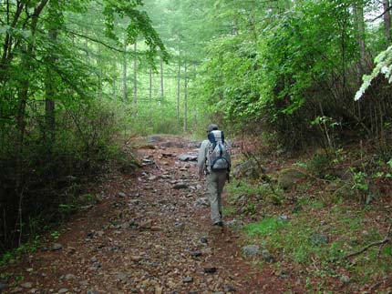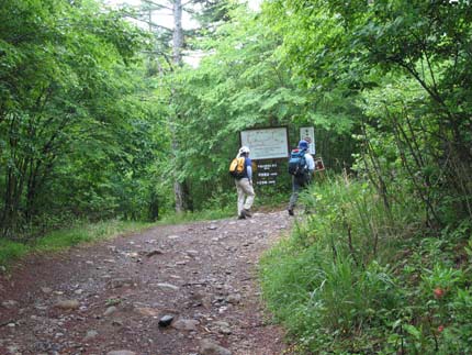 源流広場から道標に従い樹林帯の急斜面を登ると稜線上に出て国師ヶ岳方面からの分岐点と合流する。