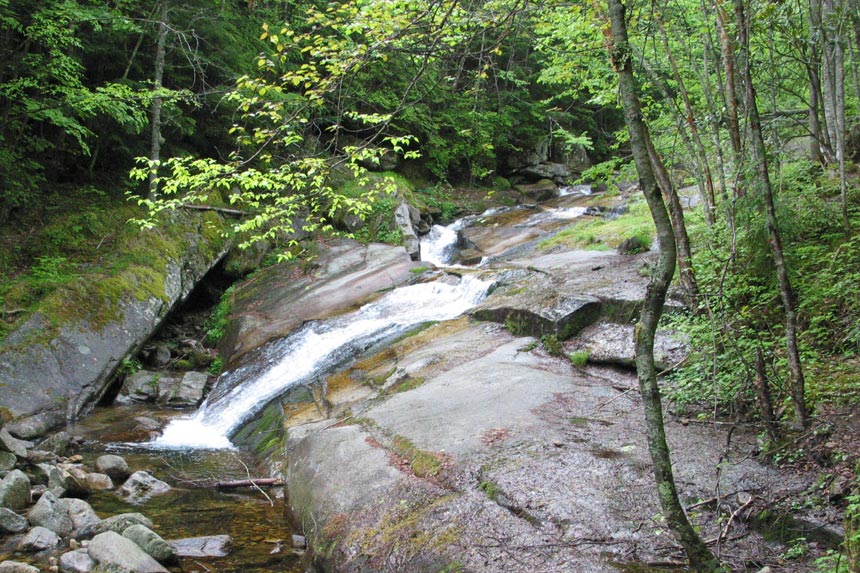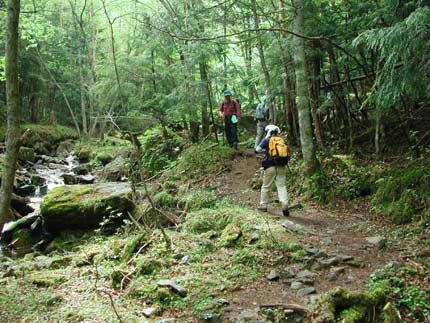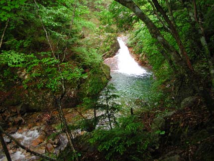 千曲川源流の西沢に沿ってよく整備された遊歩道を進むと大きな一枚岩のナメ滝が現れる。