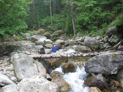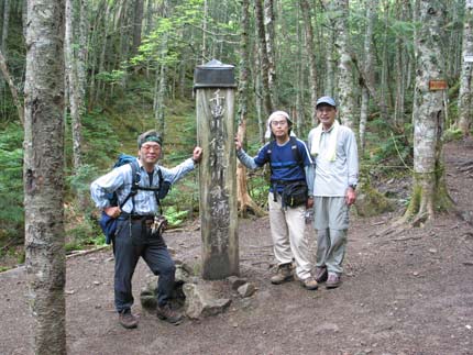 ナメ滝から一時間ほどで「千曲川・信濃川水源地標」の標柱が立つ広場に出る。 源流といっても流れは