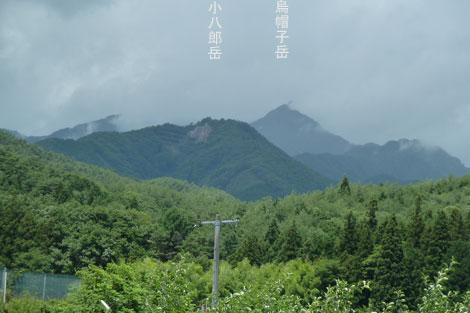 | 林道取り付きからの小八郎岳と烏帽子岳 (帰路途中に撮影) |