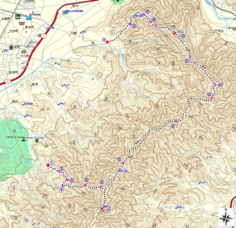 | (計曲線 50M 主曲線 10M) 関沢森林公園標高/125M 宮ノ入登山口/58M 標高差/510M 総歩行距離/11751M |