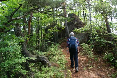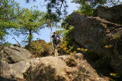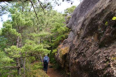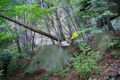| 高度を上げる | 《写真にマウスを》 稜線もうすぐの道標と背後の大岩 |
