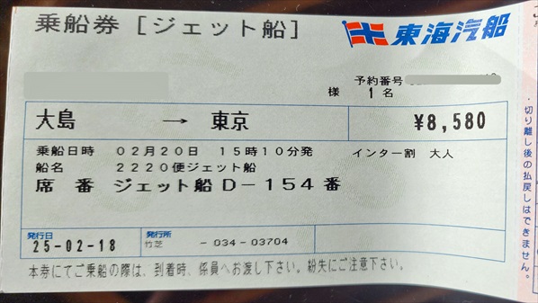 | 岡田港〜千葉の港を経由〜竹柴桟橋着のため所用時間は約2時間 (注)乗船券は下船時返却のため紛失注意 リクライニングシートではないので腰が痛くなる |