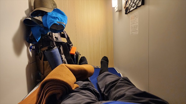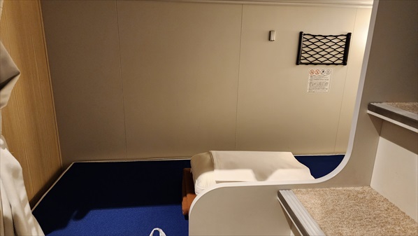 | 二段ベッド客室を選択(ベッド内100円貸金庫付) 船内レストラン利用は出航後1時間のみ/船内にカップヌードルほか自販機あり |