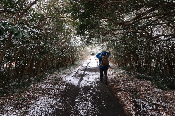 | 大島温泉ホテルコースは一直線の「こもびれトンネル」樹林帯歩きになる 轍でわかるように車も通過するので要注意 |
