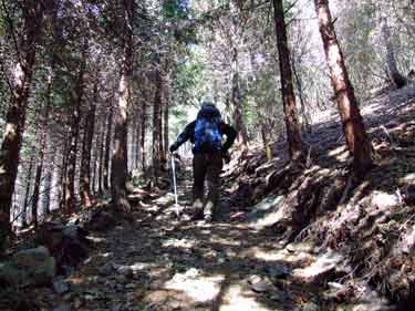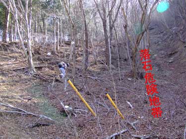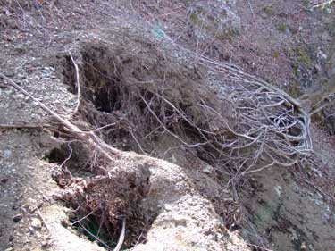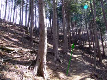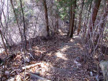 | 杉林の急登 | 急斜面の為か崩壊が進む登山道 | |||