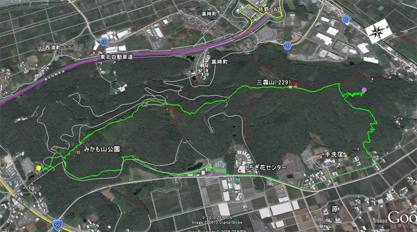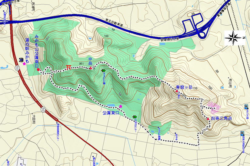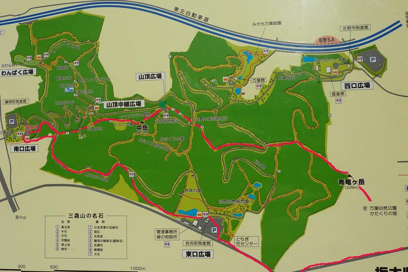 | みかも山公園ホームページ(上記地図入手可能) 赤ルート=今回の行程 | ||||