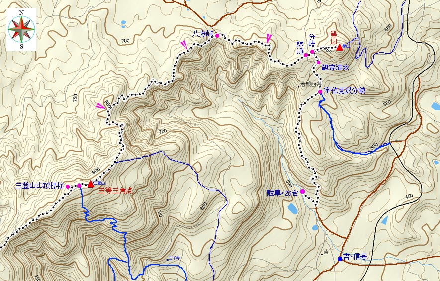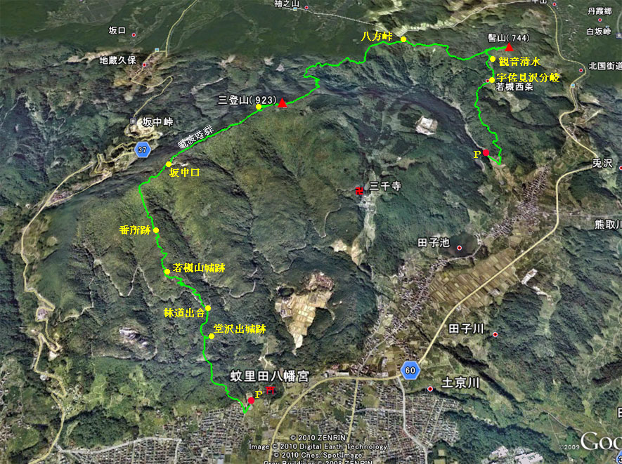 | 三登山−髻山鳥瞰図 SP駐車場標高/432M 標高差/491M 総歩行距離/10545M |