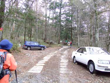 | 車道並の広さがある登山道で上部の 左カーブ先にも駐車場がある |
