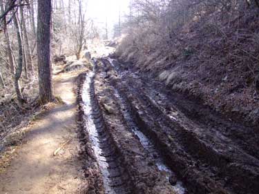 | 朝日が差し青空がのぞき始めて晴れる予感が・・・ | チェーンを巻いた轍の跡が無惨 | |||