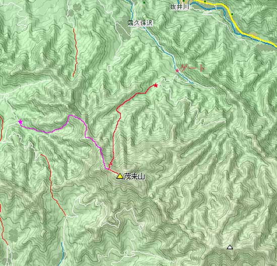 右折して舗装された広い林道茂来線を走り、国道299号から1.6kmで左へ急ターンする砂利の細い
