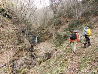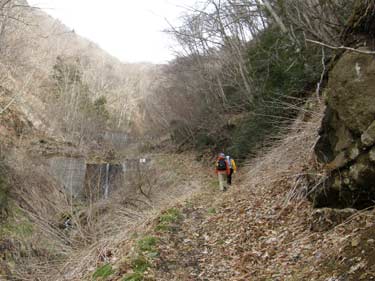 | 不動滝の沢を横切り登山口へ向かう | 蕗のとうを採りながら・・・ 前方は砂防堰堤 |