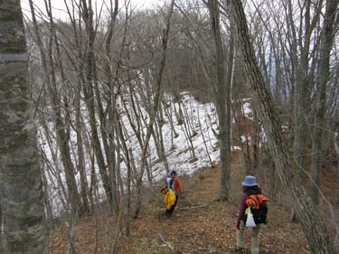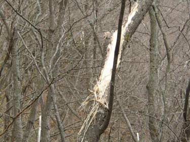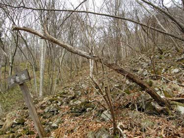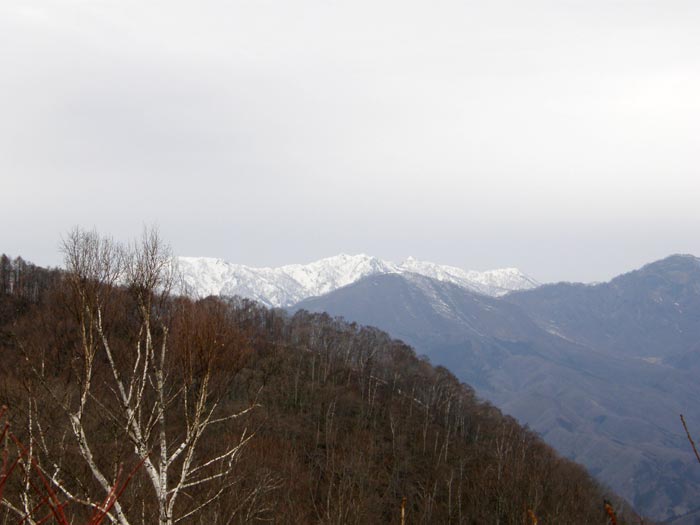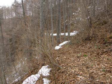 | 熊の仕業か? 真新しい傷跡が・・・ | 小川村方面には残雪が (二本記分岐点で撮影) |