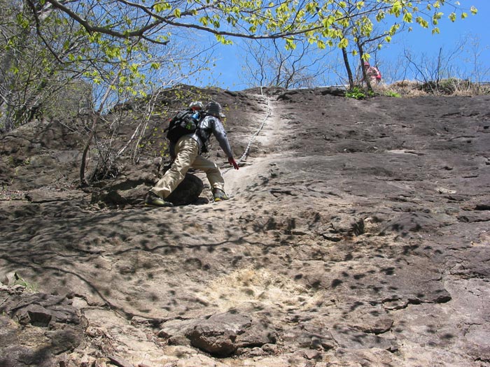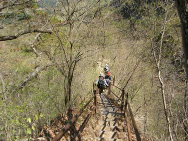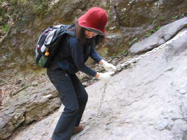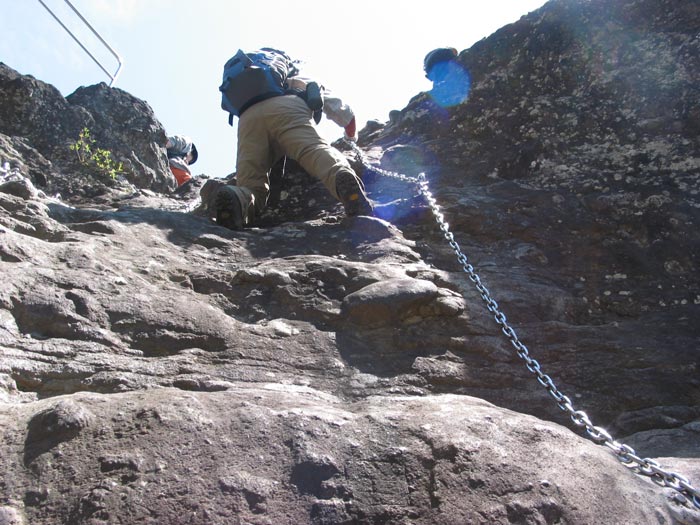 そこから登り一方の道をしばらく行くと鉄階段で岩稜を登る場所に出合う。