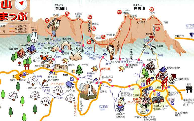 妙義神社から白雲山・金洞山の山腹を巻いて石門へ出るルートが一般的だが、